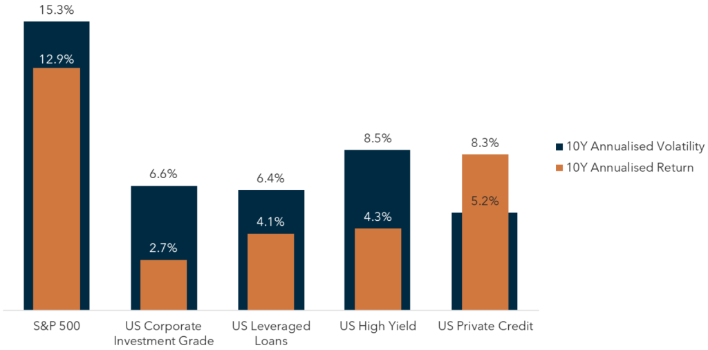 Returns in USD. 10 year period from 1 July 2013 to 30 June 2023. Sources: S&P (S&P 500 Total Return Index), Bloomberg (Bloomberg US Corporate Total Return Value Unhedged USD), Burgiss (Burgiss – Private Debt (North America)), and Thomson Reuters Datastream (ICE BofAML US High Yield Master II, S&P Leveraged Loan). S&P, Bloomberg, Burgiss and Thomson Reuters have not provided consent to the inclusion of statements utilising their data. No assurance can be given that any investment will achieve its objectives or avoid losses. Past performance is not necessarily a guide to future performance.
