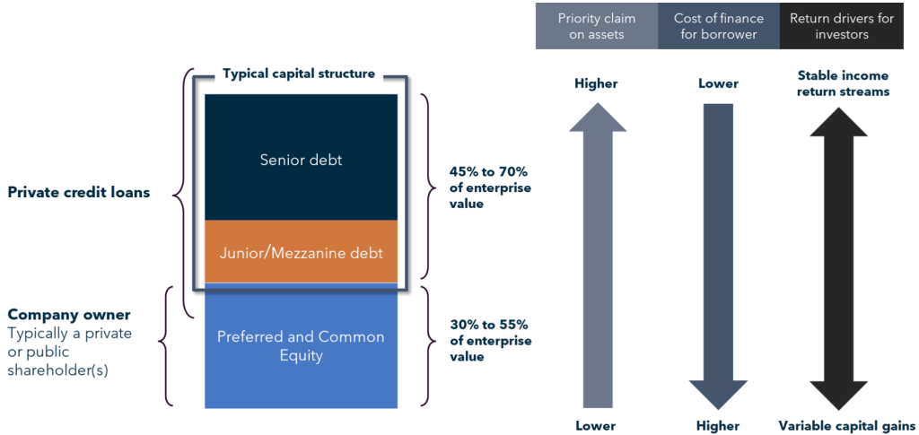 The figure below depicts where private credit typically fits within a company capital structure.