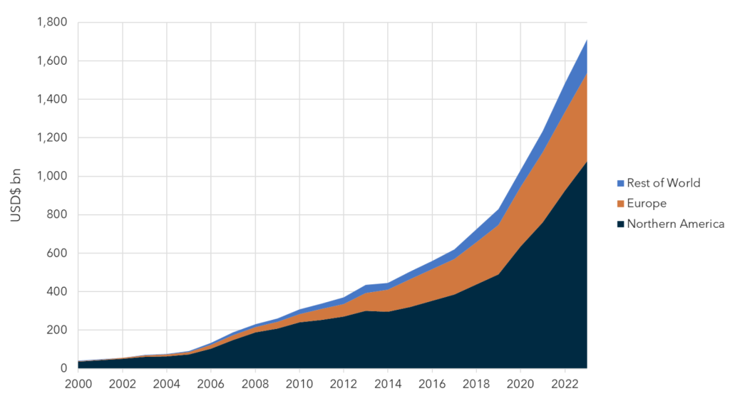 Source: Preqin.. Horizontal axis covers the period between 31 December 2000 and 30 June 2023. Preqin has not provided consent to the inclusion of statements utilising their data.