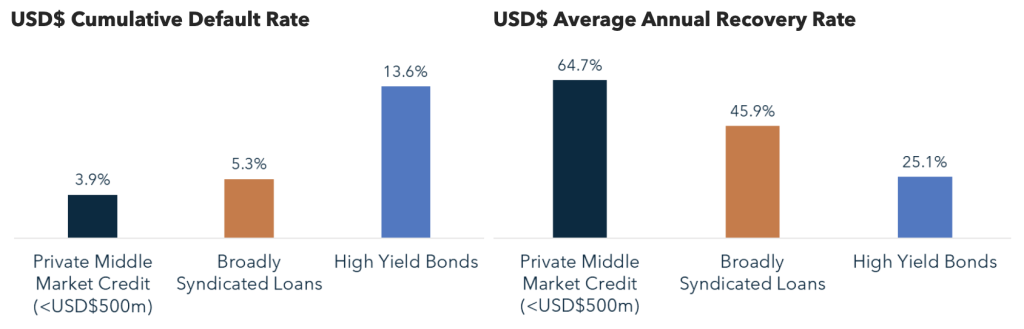 These enhanced protections have resulted in lower default rates and higher recovery rates for private credit assets relative to other credit alternatives as shown following.