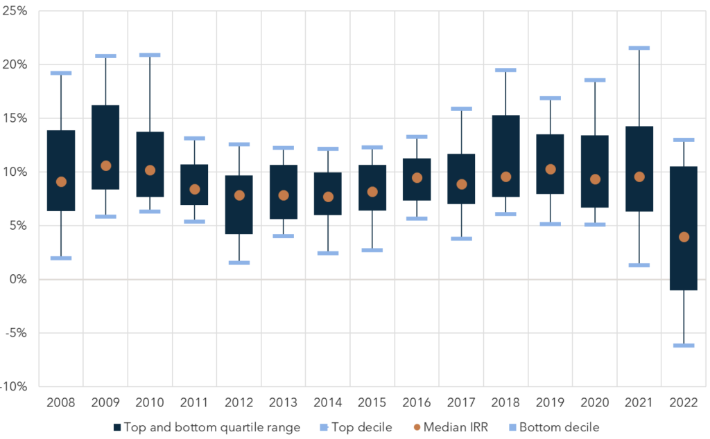 With the significant growth in global private credit there has been a significant increase in the number of private credit managers. North American and European based private credit vehicles make up around 90% of the private credit assets universe and 82% of the 2,097 private credit investment managers. Identification and selection of quality managers, being those with demonstrated experience and consistent track records of performance, can be challenging for Australian investors in the absence of having access to global networks and resources. This is particularly important given the performance dispersion of managers as shown below: