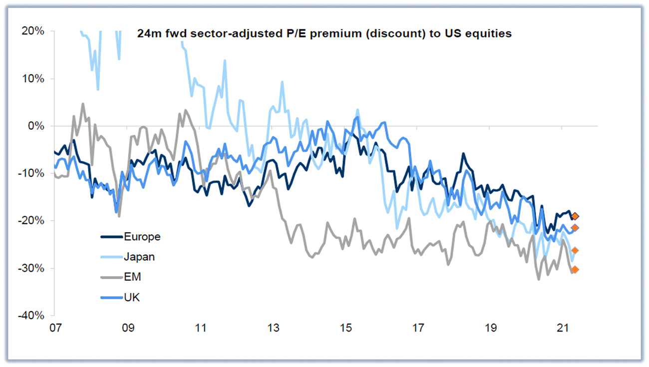 This may make sense in the context of the GDP growth differentials experienced over the last few years, but Equities are forward-looking, and the valuation differential is harder to accept in the context of the forecasts.