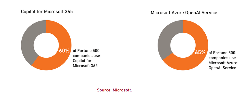 Not this time. As generative artificial intelligence (AI) is poised to potentially transform the economy, and business applications rather than consumer gadgetry move to the forefront, Microsoft’s sharp focus on its workplace-productivity software and cloud-computing platform have positioned it in the sweet spot of early AI demand. While it’s too soon to know which companies will be the biggest long-term winners from AI, Microsoft has an edge because many businesses’ workflows are already inextricably intertwined with its software. That has helped Copilot, the AI-powered chatbot that Microsoft began integrating into its products in late 2023, quickly amass a user base that includes nearly 60% of Fortune 500 companies.