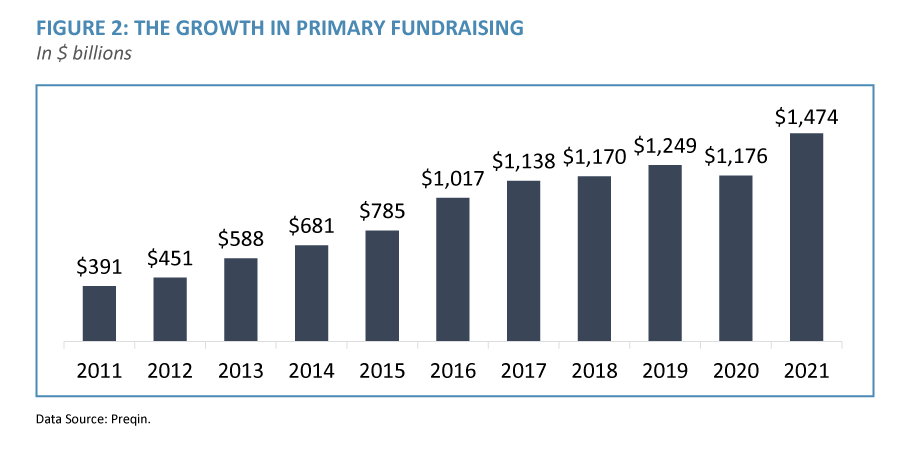 We also expect to see increased selling volume over the next 1-3 years due to the amount and pace of primary fundraising. As seen below, the amount of capital raised for private equity primary funds has more than tripled over the last ten years. Because the secondary market is a natural derivative of the primary market, we believe the continued growth in primary fundraising will naturally lead to increased secondary transaction volume as investors continue to manage their private equity investments.