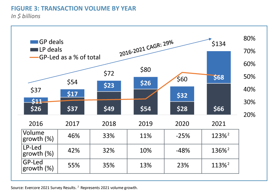 The GP-led market has exploded in the past several years as both sponsors and investors recognize the benefits of these transactions. While previously just a small portion of total deal volume, GP-led deals have increased from approximately $11 billion in 2016 to almost $70 billion in 2021 and now comprise about 50% of the overall secondary market as seen in figure 3 below.