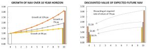 The example indicates that an investor who anticipates an investment rate return above their required rate of return may be prepared to pay more than a security’s NAV in order to ‘gain access to’ or ‘participate in’ the investment. In effect, the investor is capitalising the future return premium into the listed security’s valuation today.