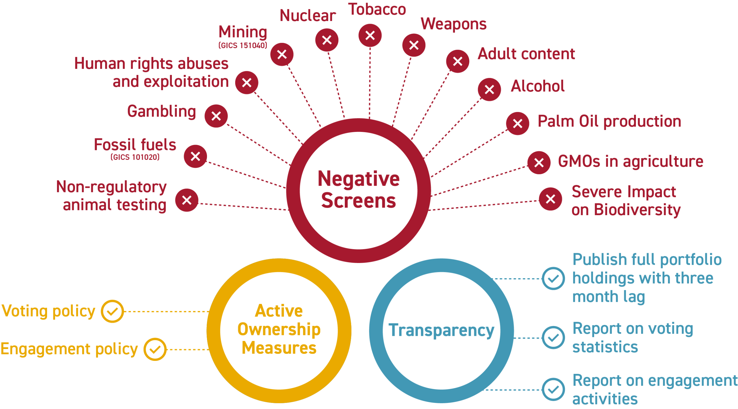 The Fund’s ethical investment policy is implemented by Axiom with oversight from Pengana. The ethical policy states the permissible extent of an investee company’s material business involvement* in screened activities. Any company that does not meet the requirements of the screen is removed from the investable universe.
