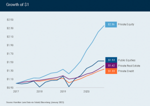 According to alternatives manager Hamilton Lane, private equity on average generated an extra 83 cents per dollar invested since 2017 relative to public markets (Chart 1).