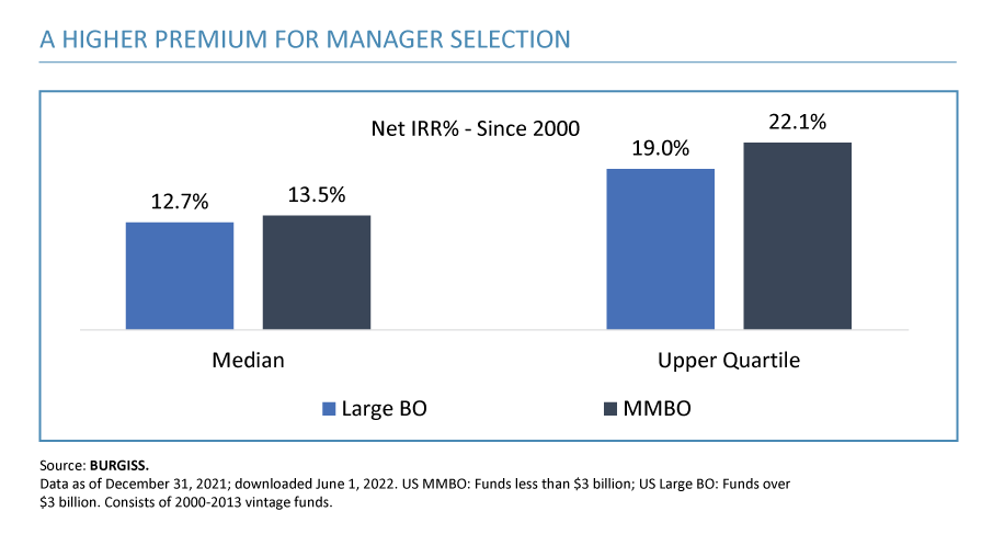 Investing in middle market buyouts provides the opportunity to generate higher returns than investing in the larger end of the market. Furthermore, partnering in deals alongside the top performing managers can lead to increased outperformance. A meaningful performance gap exists between upper quartile buyout funds focused on middle market companies and those focused on large buyouts. As seen below, upper quartile middle market buyout funds generated a 22.1% net IRR compared to 19.0% for upper quartile large buyout funds. That’s 310bps of incremental net IRR for top-performing middle market funds. Ultimately, this gap suggests that investing in middle market companies can lead to outperformance versus larger companies, and that incremental performance significantly increases when you partner with the right managers.