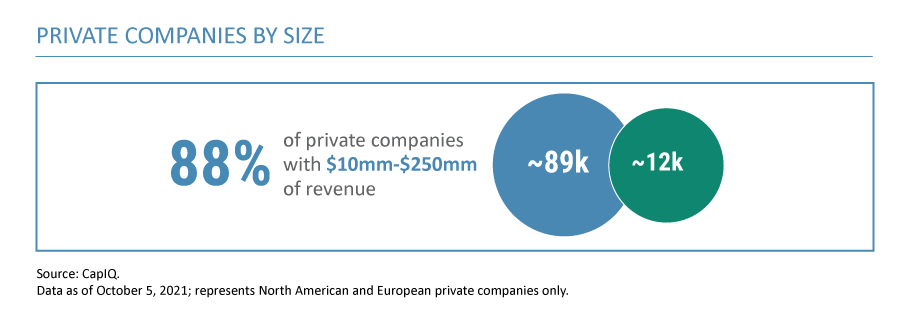 In North America and Europe there are approximately 100,000 private companies. Of those 100,00 companies, approximately 89,000 fall in the middle market, leaving investors with an abundance of potential investment opportunities and information to evaluate. Finding attractive investments relies on quickly and effectively assessing a sea of potential opportunities to find the ones that offer the right mix of value and potential. Sourcing is also less efficient in the middle market; some companies may not be working with an M&A advisor, which makes direct sourcing a more difficult but potentially more valuable activity in terms of investment returns.
