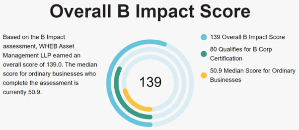 Primarily, a B Corp has to legally commit (by changing its constitutional documents), to be accountable to all stakeholders, not just its shareholders. Just as important as the legal framework, is the assessment. This is an intensive process that ensures that key stakeholders are taken into account in decision-making and that processes and performance is verified to meet high standards of social and environmental performance, transparency, and accountability. Focusing on ‘five pillars’ this requires consideration of the impact of the firm’s activities vis-à-vis Governance, Workers, Customers, Environment, and Community. During the certification process, we realised that this approach to doing business was very much aligned with WHEB’s own mission “To advance sustainability and create prosperity through positive impact investments”.